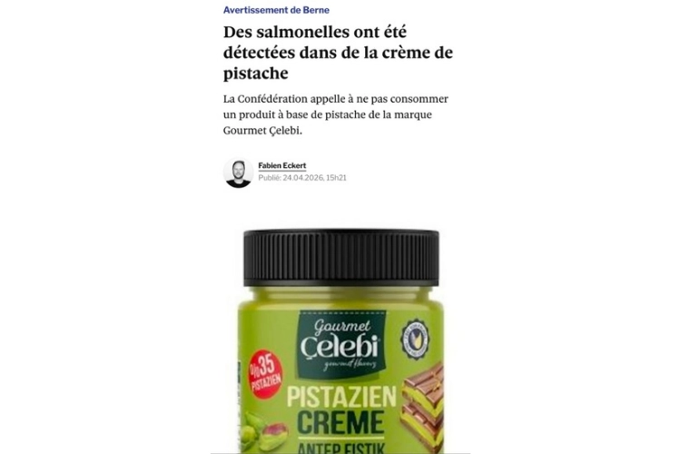 İsviçre’nin gıda otoritesi Federal Gıda Güvenliği ve Veterinerlik İşleri Ofisi (OSAV), yaptığı açıklamada “Gourmet Çelebi” markalı Antep fıstığı kremasında salmonella bakterisi tespit edildiğini duyurdu. Kurum, söz konusu ürünün ülke genelinde toplatıldığını ve satışının yasaklandığını bildirdi.