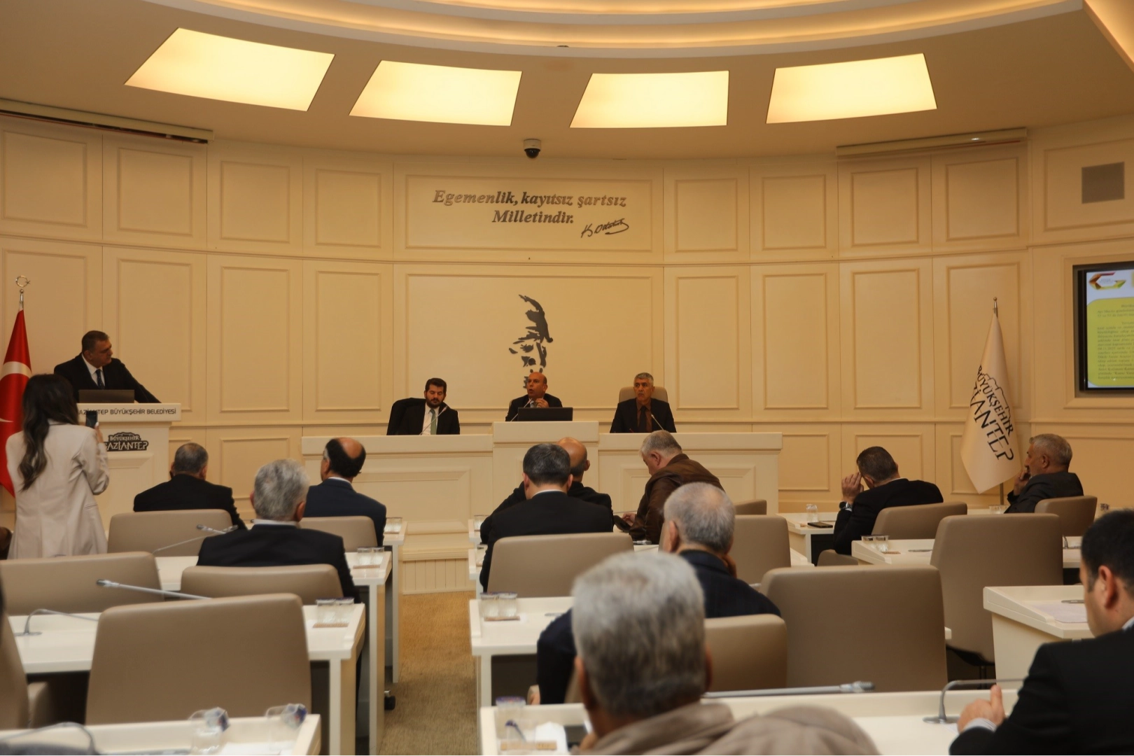 Genel Sekreter Cihan’dan üniversite öğrencilerine sunum Toplantının son bölümünde ise bileşimi takip etmek üzere salonda bulunan Gaziantep Üniversitesi Siyaset Bilimi ve Kamu Yönetimi Bölümü öğrencilerine, Gaziantep Büyükşehir Belediyesi Genel Sekreteri Sezer Cihan tarafından meclisin işleyişi, yerel yönetimlerdeki görev ve sorumlulukları ile belediye çalışmaları hakkında bilgilendirici bir sunum yapıldı.