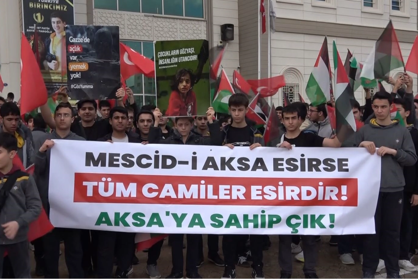 İşgalci İsrail'in "olağanüstü hal" ve İran'a yönelik savaştan kaynaklanan güvenlik şartları bahanesiyle Mescid-i Aksa'yı ibadete kapatmasına da tepki gösteren Arslan, "Bununla beraber ilk kıblemiz Mescid-i Aksa, 850 yıldır ilk defa ibadete kapatıldı. İnsanlık haklarından hiçbirine saygısı olmayan Siyonist devlet, insanların ibadet haklarına da müdahale etti. Bunlar bu cesareti ellerindeki güç ve silahla beraber 2 milyar Müslüman aleminin sessizliğinden almaktadır. Bu konuda İslam dünyasının liderlerinden ortak ve etkili bir irade bekliyoruz. Mescid-i Aksa'nın kapanmasıyla tüm mabetlerimize gölge düşmüş, mabedimize namahrem eli değmiştir. Biz Müslüman gençler olarak buradan haykırıyoruz. Mescid-i Aksa bir gün mutlaka özgürleşecektir. Mescid-i Aksa'nın kutsallığına gölge düşüren her namahrem el kırılacak ve bunun hesabı mutlaka sorulacaktır. Filistin halkı da Mescid-i Aksa da yalnız değildir. Zulme karşı susmayacağız. Geri adım atmayacağız, insanlık onuru için sesimizi yükseltmeye devam edeceğiz. Buradan vicdan sahibi herkesi bu zulmü haykırmaya ve protesto etmeye davet ediyoruz. Gülşen Batar Anadolu Lisesi gençliğine çağrıda bulunuyoruz; bu konuda bizimle misiniz? ‘Zalimler için yaşasın cehennem' diyor ve Gazze'nin zindanlarında şehadeti bekleyen yiğitlere selamlarımızı ve dualarımızı gönderiyoruz" diye konuştu.