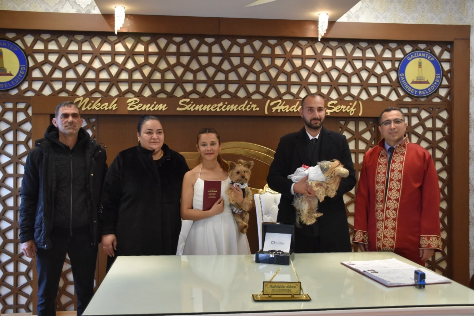 Hayatlarını birleştiren Dilek Öztürk ile Hakan Özbek, bugüne kadar benzerine rastlanmamış bir nikah töreni gerçekleştirdi. Nikah için Şahinbey Belediyesi Evlendirme Memurluğuna başvuran Dilek Öztürk ile Hakan Özbek, nikah salonuna gelinlik ve damatlık giydirdikleri Yorkshire teriyeri cinsi köpekleri ile geldi.