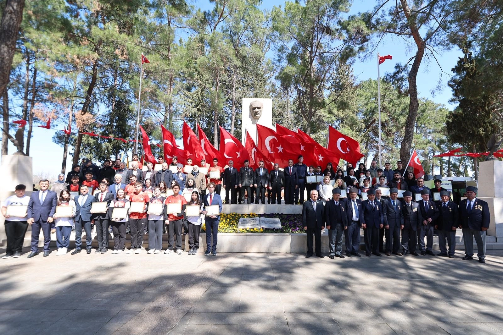 Düzenlenen tören, Şehitler için saygı duruşu, İstiklal Marşının okunması ve saygı atışıyla başladı. Ardından protokol tarafından buket sunumu yapıldı, törene katılan öğrenciler, Şahinbey şiirini ve İstiklal Marşını okudular. Destansı bir mücadele verildi