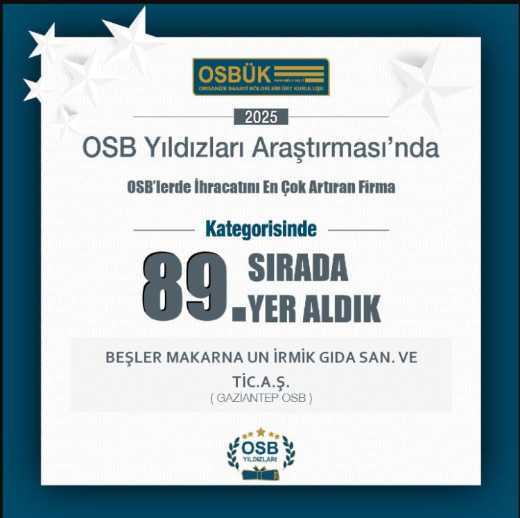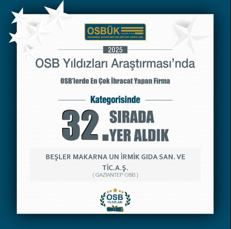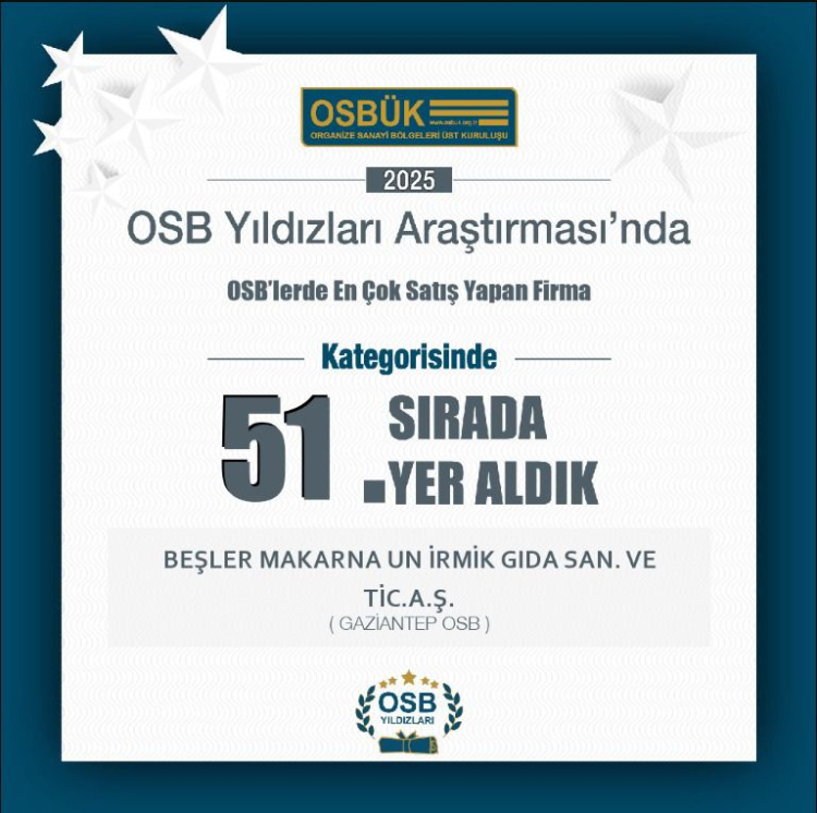 Gıda üretimi ve ihracatıyla Türkiye’nin önde gelen markaları arasında yer alan Beşler Grup, 2025 yılı OSB Yıldızları Araştırması’nda elde ettiği başarılarla hem şehir hem de ülke ekonomisine sağladığı katkıyı bir kez daha tescillemiş oldu.
