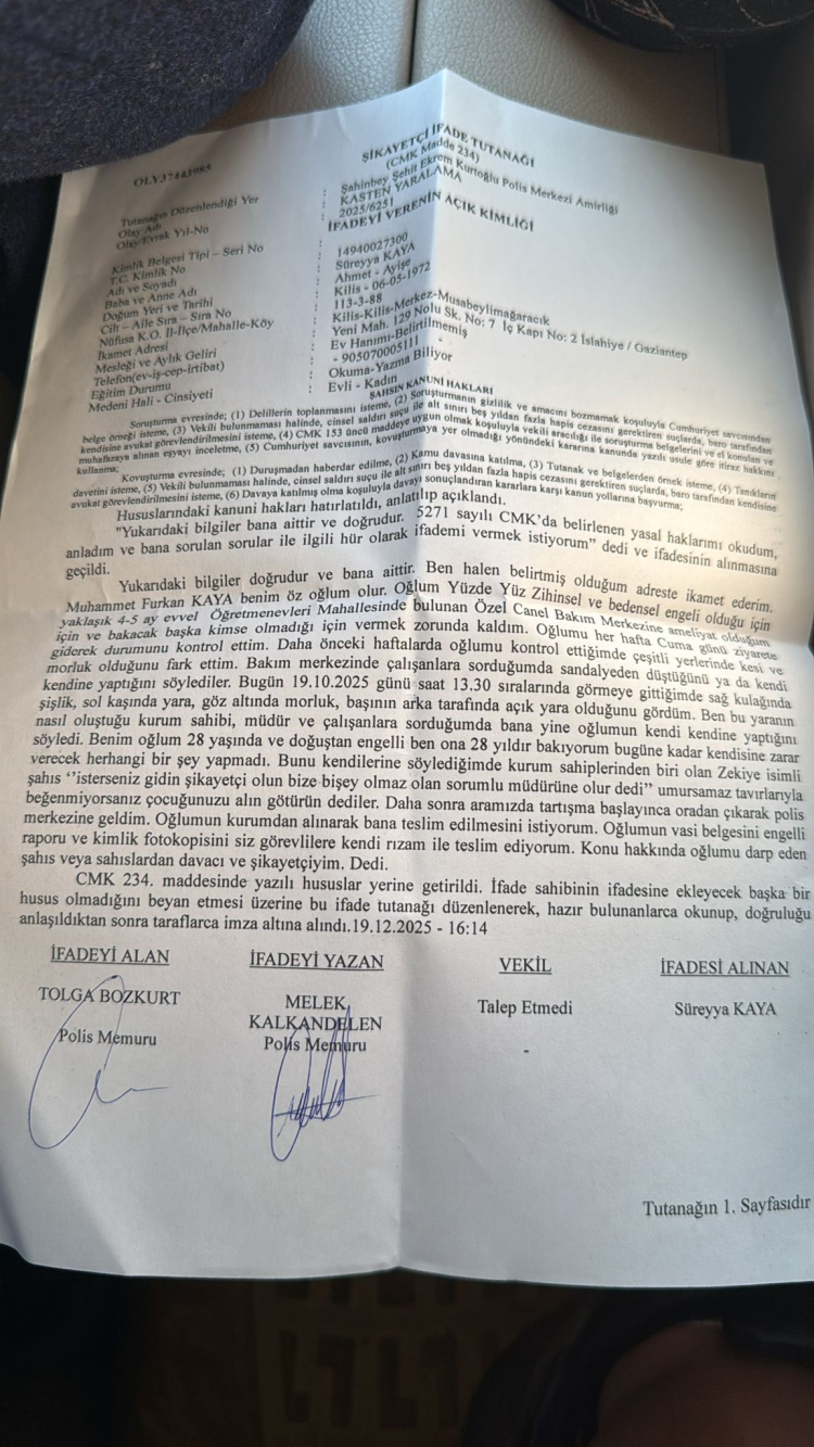 Gaziantep Şahinbey Canel Engelli Bakım Merkezi'nde kalan Muhammed Furkan Kaya'nın ailesi çocuklarını ziyarete gittiklerinde Muhammed Furkan Kaya'nın darp edildiğini gördüklerini söylediler.