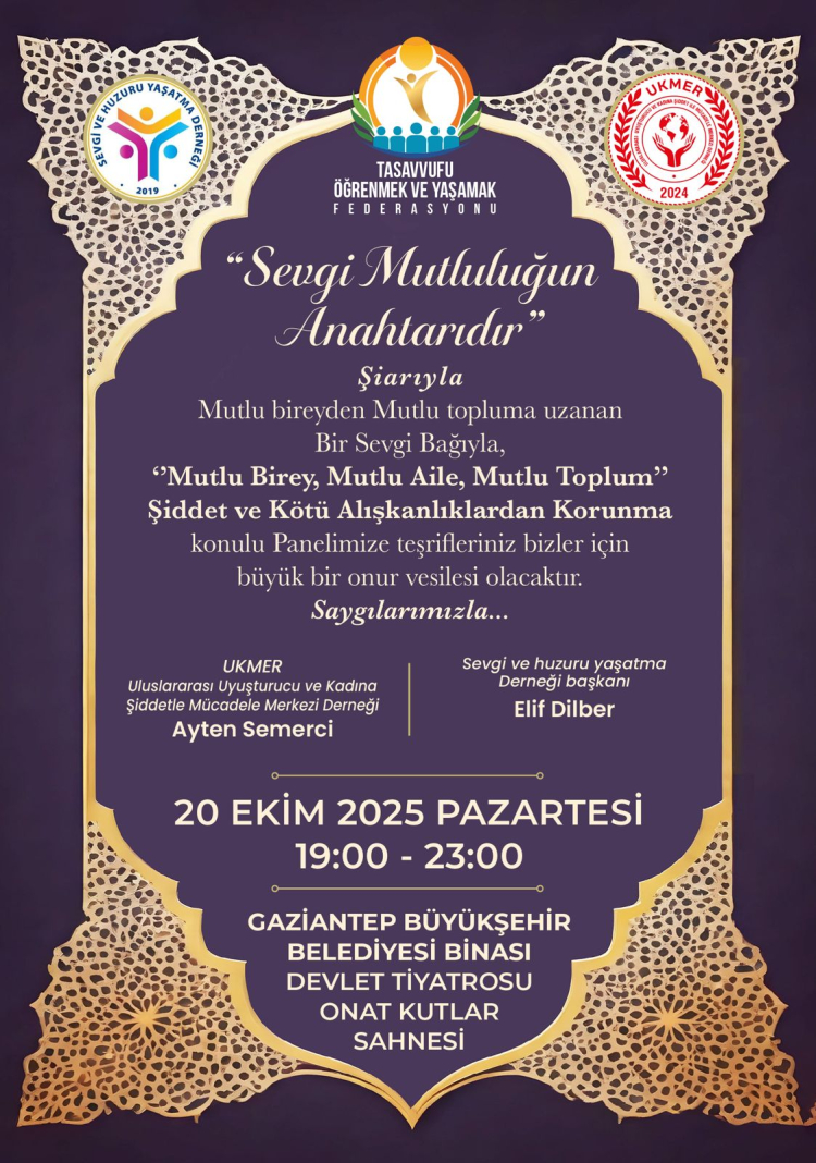 2025 yılı “Aile Yılı” kapsamında Gaziantep’te düzenlenen panel, bireysel huzurdan toplumsal barışa uzanan bir yolculuğa davet ediyor.