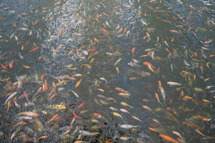 Balıkları kendi elleriyle besleyen ve unutulmaz anlar yaşayan ziyaretçilerden kimileri de balıkları yem ile besliyor. Yem atılmasıyla ve biberonun uzatılmasıyla birlikte aynı alanda toplanan koi balıkları bir an önce sıranın kendisine gelmesini bekliyor. Ziyaretçiler ise bir taraftan balıkların beslenme anını meraklı bakışlarla takip ederken bir taraftan da balıkları beslemeye devam ediyor.