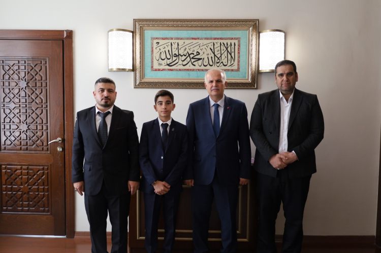İl Müftüsü Hazırlar, kurs müdürü Kiraz, Bayramoğlu ve hocası Çiloğlu ile sohbet etti, başarısı için genç hafıza dua etti.
