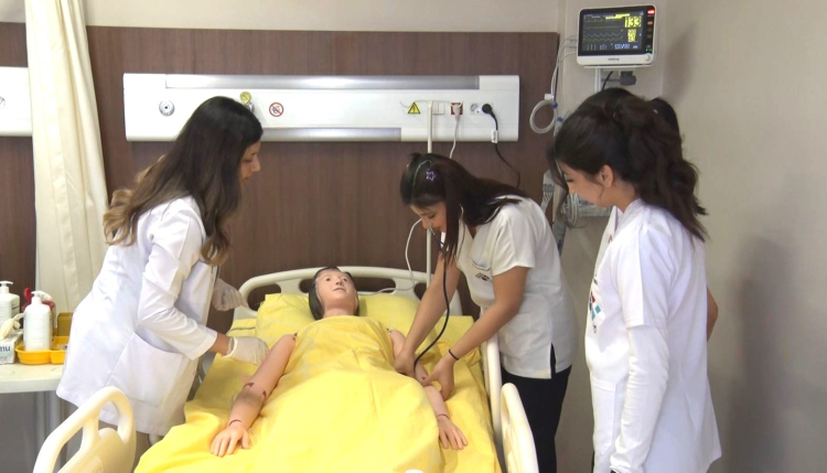 Gaziantep'te yüksek gerçeklikli simülatör hasta maketi üzerinde uygulamalı ders görerek meslek hayatına hazırlanan hemşire adayları, tedavi yöntemlerini uygulamalı öğrenerek tecrübe sahibi oluyor.