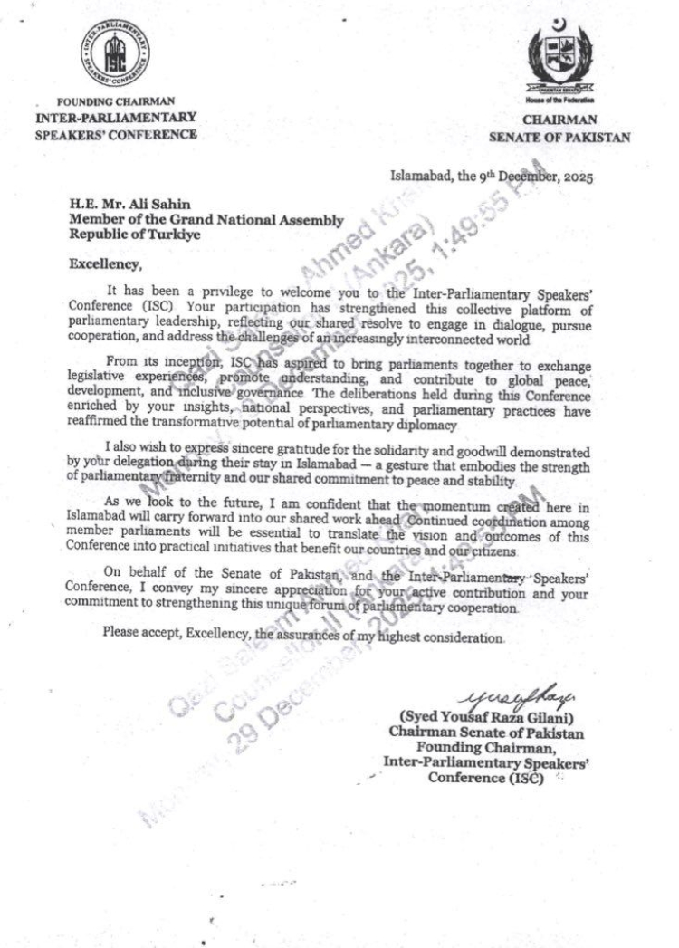 Gilani, 9 Aralık 2025 tarihli mektubunda, Ali Şahin’in konferansa katılımının parlamenter liderliğin uluslararası düzeyde güçlendirilmesine önemli katkı sunduğunu belirterek, diyalog, iş birliği ve küresel sorunlara ortak çözüm üretme iradesinin bu platformda güçlü biçimde yansıtıldığını ifade etti.