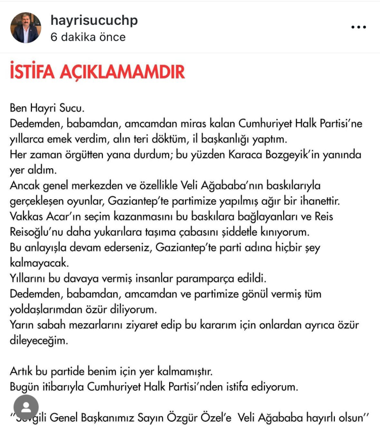 HAYRİ SUCU CHP'DEN İSTİFA ETTİ